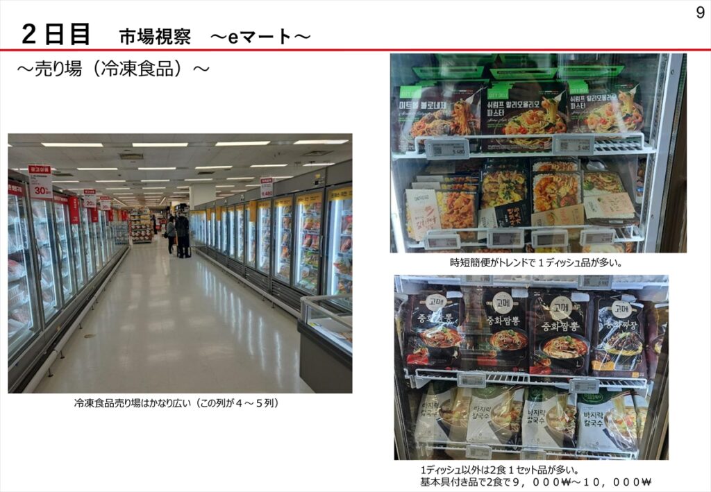 2日目 ソウル市内マーケット視察・冷凍食品購入 (Eマート、THE HYUNDAI 等)、ホテルにて購入した冷凍食品の試食、その後、各自市場調査